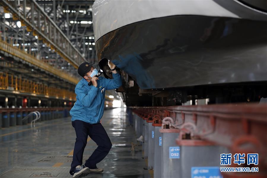 4月7日,武漢動車段運(yùn)用車間綜合檢修班工長楊磊在檢查車輛情況。 新華社記者 沈伯韓 攝