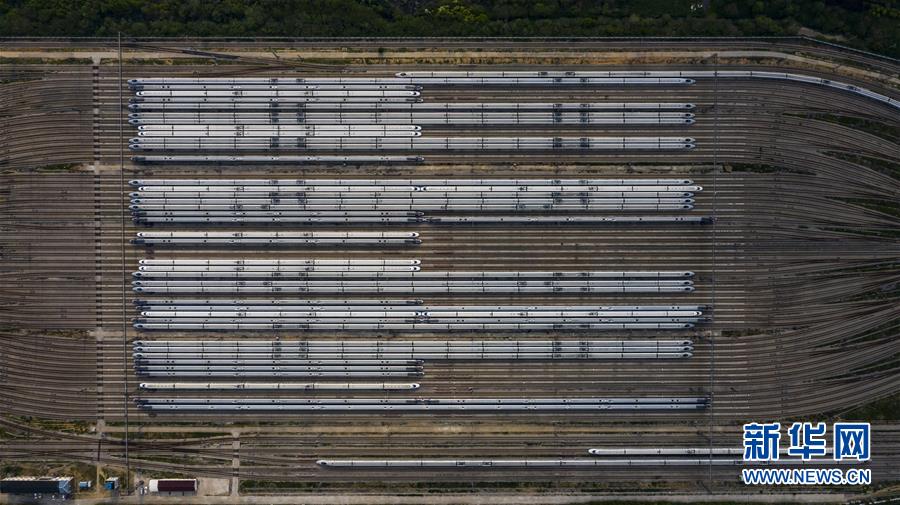 4月7日,在武漢動車段,列車停靠在存車線上(無人機(jī)照片)。新華社記者 沈伯韓 攝