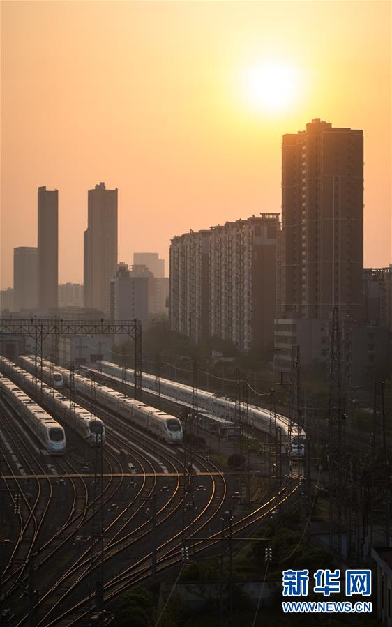 4月8日,在武漢動車段,列車??吭诖孳嚲€上準備投入運行。 新華社記者 肖藝九 攝