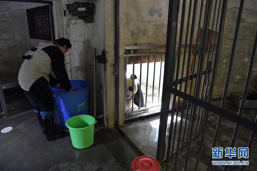 4月14日,中國大熊貓保護(hù)研究中心核桃坪基地飼養(yǎng)員周季秋在大熊貓“喜妹”的圈舍內(nèi)打掃衛(wèi)生。新華社記者張超群攝