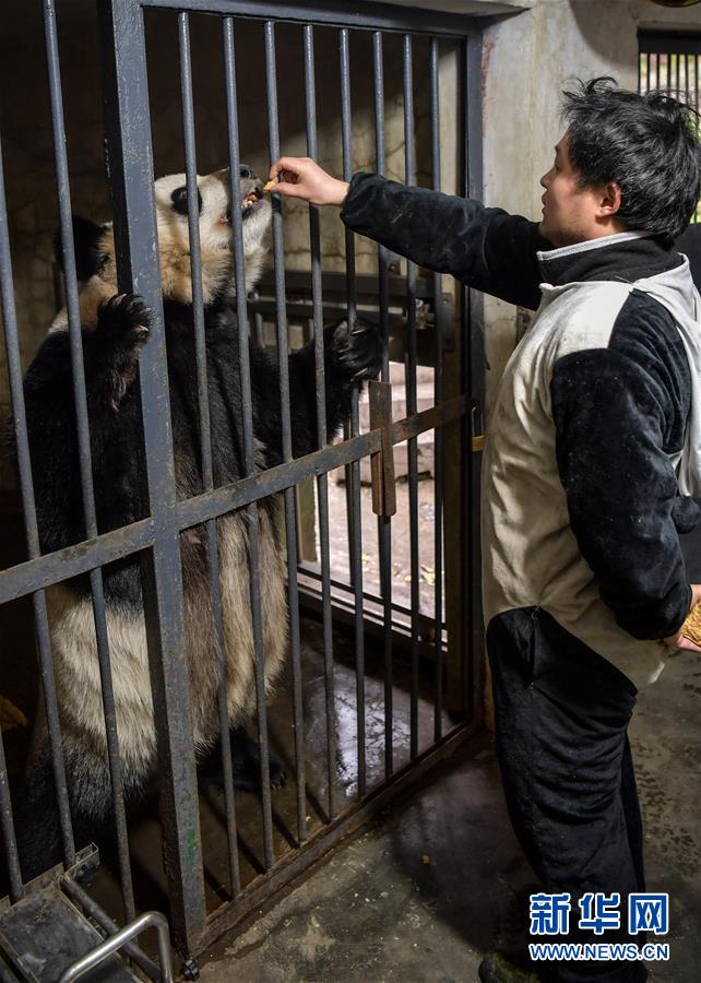 4月14日,中國(guó)大熊貓保護(hù)研究中心核桃坪基地飼養(yǎng)員周季秋用投喂窩窩頭的方法訓(xùn)練大熊貓“喜妹”的下肢力量。新華社記者張超群攝