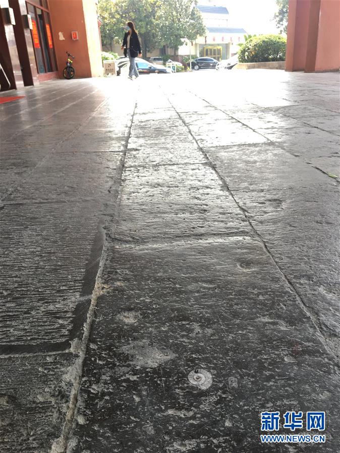 這是4月9日在張家界市區(qū)一路面拍攝的遠古海洋生物化石地板。新華社記者蘇曉洲攝