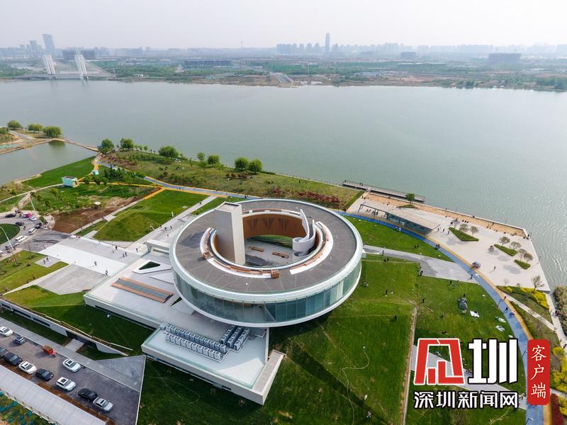 2020年4月21日,河南省鄭州市,北龍湖畔出現(xiàn)了一座巨大的圓環(huán)狀建筑,又酷似一頂圓型王冠,建筑周邊的斜坡草坪呈金字塔狀,圓環(huán)建筑仿佛“懸浮”在空中,造型別致。這座建筑是鄭州鄭東新區(qū)龍湖公共藝術(shù)中心。