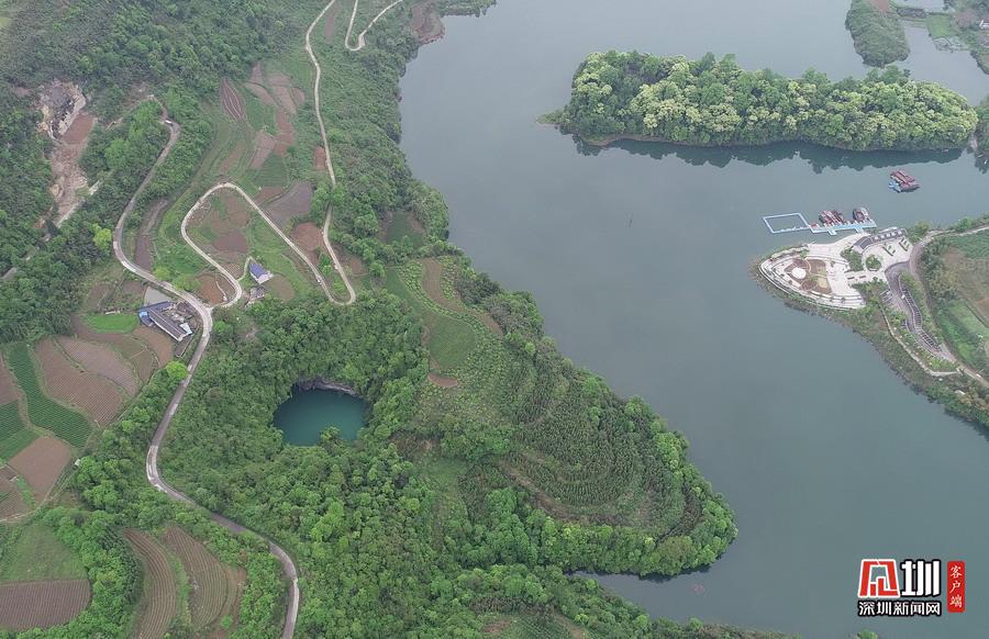 2020年4月24日,在湖南張家界市永定區(qū)“百里畫廊”茅巖河景區(qū)拍攝的“天坑心湖”。(無人機(jī)拍攝)