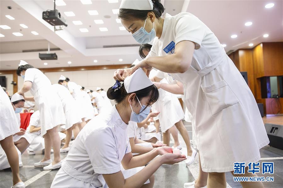 4月26日,北京大學(xué)人民醫(yī)院新入職護(hù)士參加授帽儀式。當(dāng)日,北京大學(xué)人民醫(yī)院為97名2019屆新入職護(hù)士舉行隆重莊嚴(yán)的授帽儀式和重溫南丁格爾誓言的活動(dòng),以此紀(jì)念南丁格爾誕辰200周年和即將到來的“國際護(hù)士節(jié)”。活動(dòng)還邀請了5名援鄂國家醫(yī)療隊(duì)護(hù)士代表分享戰(zhàn)“疫”故事。新華社記者張玉薇攝