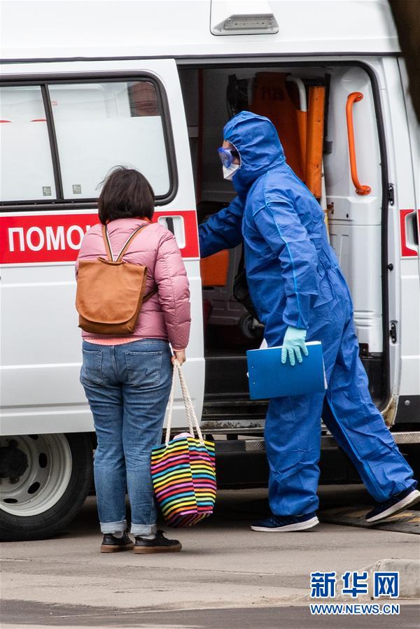 4月27日,在俄羅斯首都莫斯科,醫(yī)護(hù)人員(右)引導(dǎo)一名女子走上救護(hù)車。據(jù)俄羅斯防疫指揮部27日消息,過(guò)去24小時(shí)俄新增新冠肺炎確診病例6198例,累計(jì)確診87147例,單日增幅7.66%。新華社記者白雪騏攝