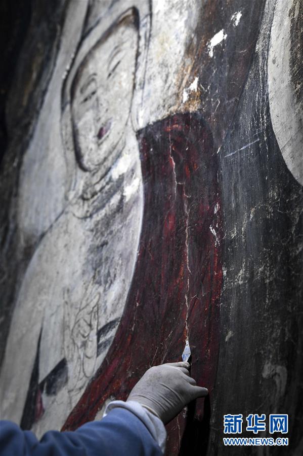 4月27日,文物修復(fù)專家在寧夏須彌山石窟圓光寺48號(hào)窟內(nèi)修復(fù)壁畫。新華社記者馮開華攝
