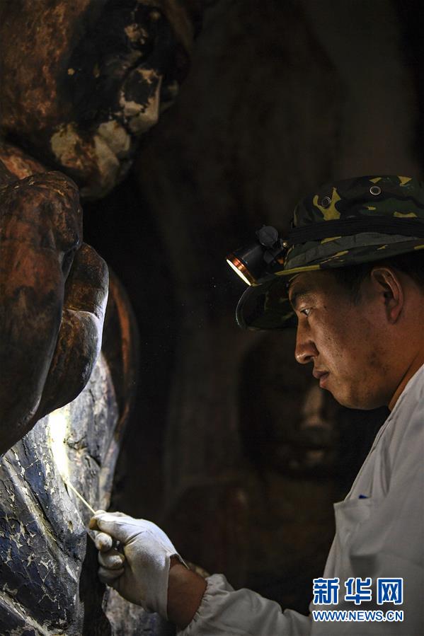 12月25日,在麥積山石窟第11窟,修復(fù)師牟常有對(duì)塑像破損處進(jìn)行加固處理。新華社記者馬寧攝