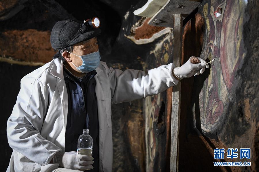 4月27日,文物修復(fù)專家在寧夏須彌山石窟圓光寺48號(hào)窟內(nèi)修復(fù)壁畫。新華社記者楊植森攝