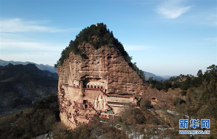 12月26日無人機拍攝的雪后晴空下的麥積山石窟。新華社記者馬寧攝