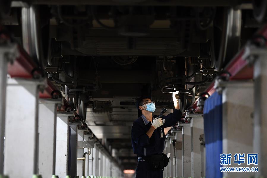 4月29日夜,合肥南動(dòng)車運(yùn)用所的工作人員對(duì)動(dòng)車組進(jìn)行檢修。每當(dāng)夜深人靜的時(shí)候,合肥南動(dòng)車運(yùn)用所卻燈火通明,“動(dòng)車安全守護(hù)者”們堅(jiān)守崗位,對(duì)動(dòng)車組進(jìn)行全面細(xì)致檢修。新華社記者 劉軍喜 攝