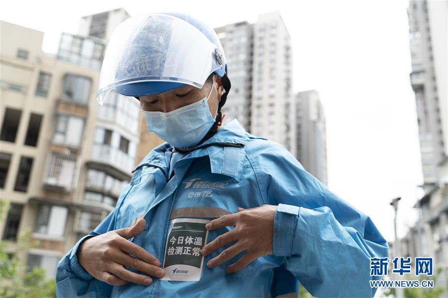 4月22日,在四川省成都市的一家外賣配送站點,邱有哈子接受體溫檢測后貼上合格標簽。 新華社記者 李夢馨 攝