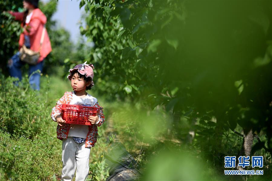 5月3日,游客在豐樂鎮(zhèn)鳳嶺苗木種植扶貧產(chǎn)業(yè)園里體驗采摘櫻桃。新華社記者劉軍喜攝