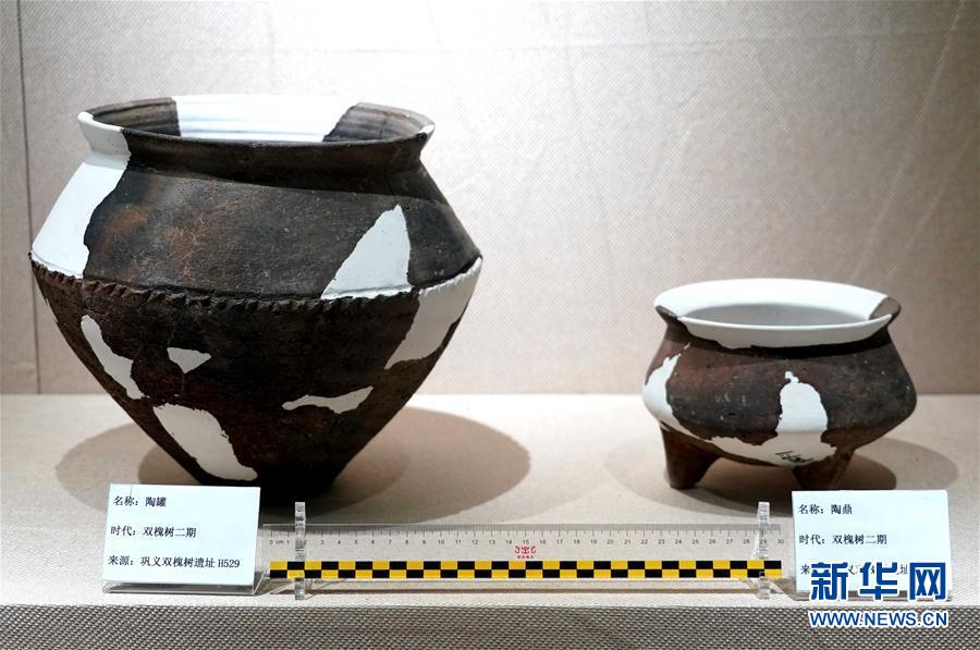 這是雙槐樹遺址出土的陶罐(左)、陶鼎(2019年8月27日攝)。新華社記者李安攝