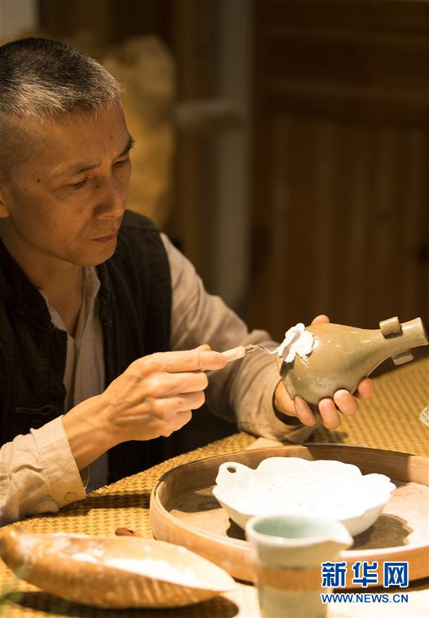5月8日,項(xiàng)宏金在龍泉青瓷裝飾紋樣研究所修復(fù)古瓷器。1965年出生的項(xiàng)宏金,被浙江龍泉年輕一代瓷人稱為“項(xiàng)哥”,他從20世紀(jì)90年代開始收集龍泉青瓷標(biāo)本,研究青瓷紋樣。2014年出版著作《龍泉青瓷裝飾紋樣》,次年開設(shè)龍泉青瓷裝飾紋樣研究所,將自己收藏的千余件標(biāo)本跟瓷器愛好者、創(chuàng)作者免費(fèi)分享。新華社記者翁忻旸攝