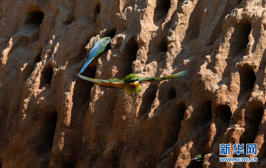 在??谖逶春酉掠畏浠⒈Wo小區(qū),栗喉蜂虎在沙質(zhì)土坡上起飛(5月7日攝)。新華社記者楊冠宇攝