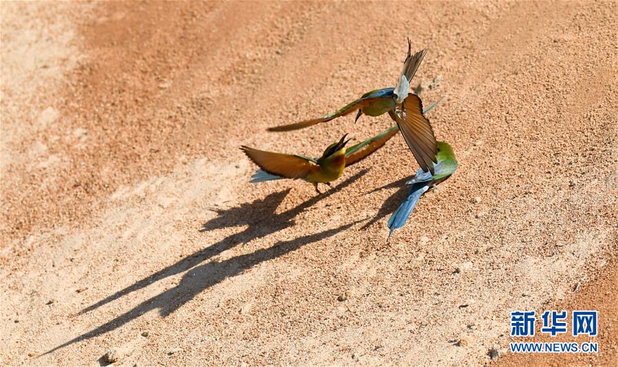 在海口五源河下游蜂虎保護小區(qū),栗喉蜂虎在嬉戲(5月7日攝)。新華社記者楊冠宇攝