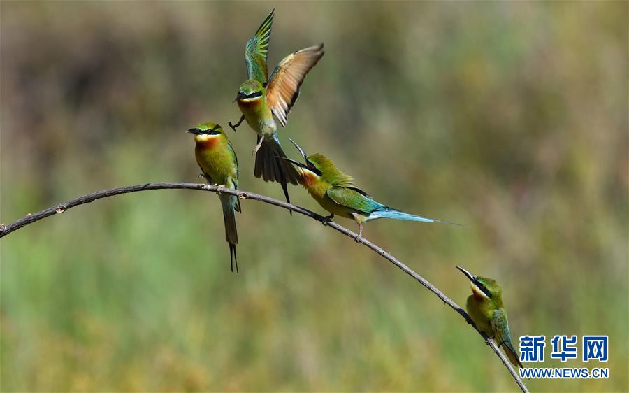 在海口五源河下游蜂虎保護(hù)小區(qū),栗喉蜂虎在嬉戲(5月7日攝)。新華社記者楊冠宇攝