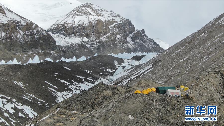這是海拔5800米的過渡營地(5月8日攝,無人機照片)。珠峰過渡營地海拔5800米,是連接前進營地和珠峰大本營的重要一站。登山愛好者從大本營徒步大約四個小時就能抵達過渡營地。此段路程亂石林立,同時也能欣賞壯美的冰川。新華社記者孫非攝