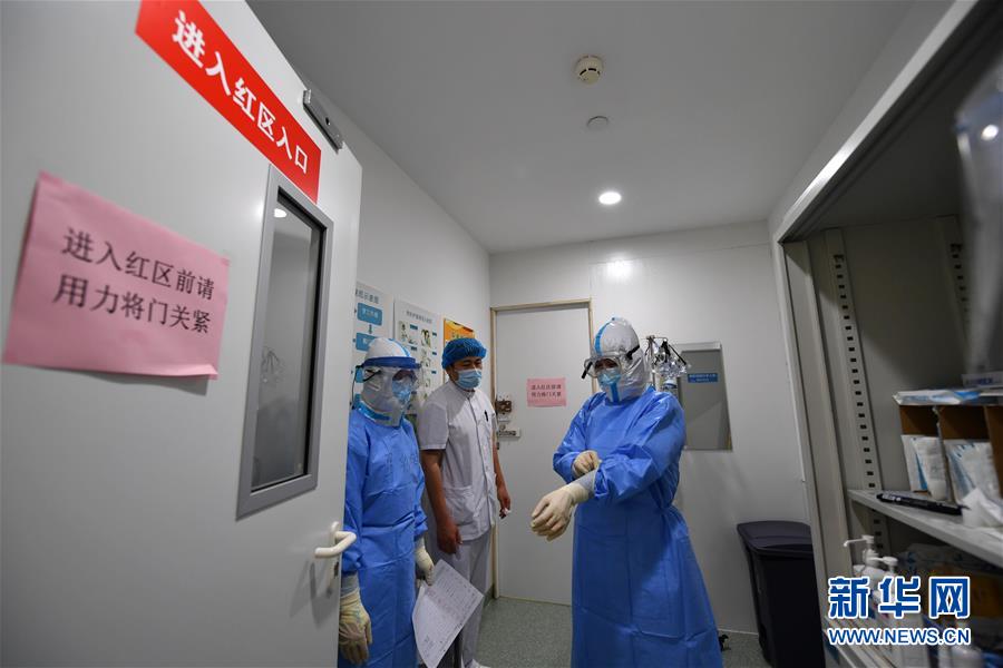 5月11日,在空港醫(yī)院隔離病房,穿戴好防護服的醫(yī)護人員準備進入“紅區(qū)”。