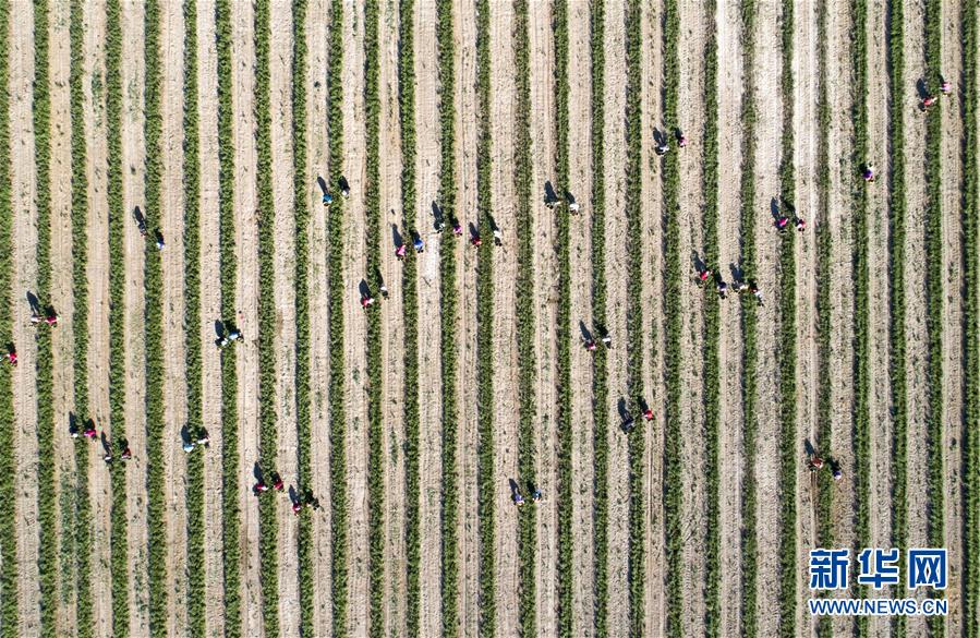 5月11日,采茶工在寧夏百瑞源賀蘭山基地采摘枸杞芽茶(無人機照片)。當日,寧夏百瑞源賀蘭山基地枸杞芽茶全面進入采摘季。據(jù)了解,該基地茶園面積300余畝,助力附近200多名農民就業(yè)增收。新華社記者楊植森攝