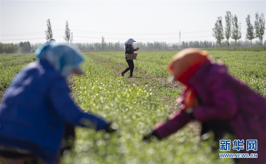 5月11日,采茶工在寧夏百瑞源賀蘭山基地采摘枸杞芽茶。當日,寧夏百瑞源賀蘭山基地枸杞芽茶全面進入采摘季。據(jù)了解,該基地茶園面積300余畝,助力附近200多名農民就業(yè)增收。新華社記者楊植森攝