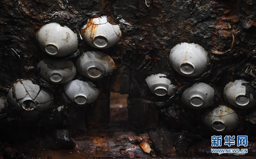 這是在廣東陽江海陵島拍攝的“南海I號”船體上嵌入的瓷器(5月12日攝)。新華社記者鄧華攝
