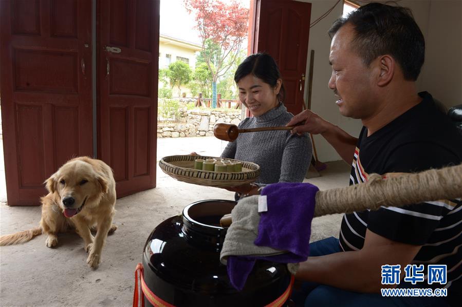 5月14日,在貴州省畢節(jié)市百里杜鵑管理區(qū)黃泥鄉(xiāng)龍?zhí)链逡患揖谱鞣唬瑑晌淮迕裨谟^察蒸餾出酒。貴州省畢節(jié)市百里杜鵑管理區(qū)黃泥鄉(xiāng)龍?zhí)链宓凝執(zhí)凉啪疲颡?dú)特的古法釀酒技術(shù),口感獨(dú)特而遠(yuǎn)近聞名。全村有釀酒戶142戶,年產(chǎn)量達(dá)45萬多公斤,龍?zhí)凉啪七h(yuǎn)銷重慶、廣東、浙江等地,龍?zhí)凉啪埔殉蔀辇執(zhí)寥嗽鍪盏闹匾獊碓?。新華社記者楊楹攝