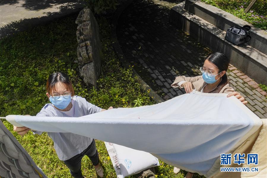 5月15日,在西南大學(xué)一棟宿舍樓下,一名返校大學(xué)生(左)在輔導(dǎo)員老師的幫助下曬被子。當日,重慶西南大學(xué)迎來疫情以來首批返校大學(xué)生。據(jù)介紹,按照疫情防控的需要,重慶市高校2020年春季學(xué)期從5月11日起按照“一校一策”原則,實行錯峰錯時分批次有序開學(xué)復(fù)課。新華社記者劉潺攝