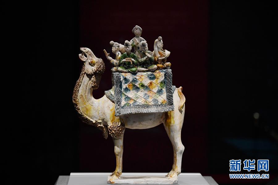 這是在陜西歷史博物館展出的唐三彩駱駝?shì)d樂俑(3月25日攝)。新華社記者 李一博 攝
