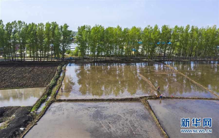 5月17日,在吉林省長春市雙陽區(qū)徐家村,農民在水稻田間耕作(無人機照片)。新華社記者許暢攝