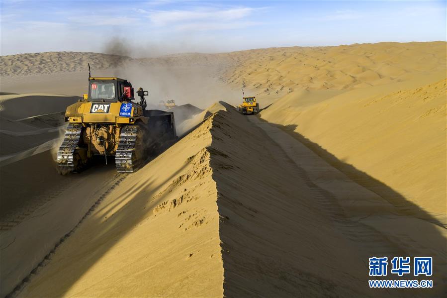 世界第二大流動沙漠——塔克拉瑪干沙漠東部腹地,風(fēng)依舊在吹。極細的沙粒隨風(fēng)飄蕩,無孔不入。新疆尉犁至且末沙漠公路施工現(xiàn)場仍是機器轟鳴,多臺大型推土機一字排開,將高聳的沙山緩緩?fù)破健?/p>