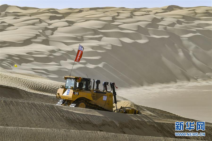 在新疆尉犁至且末沙漠公路施工現(xiàn)場,工人駕駛大型推土機推平沙山(5月16日攝)。新華社記者宋彥樺攝