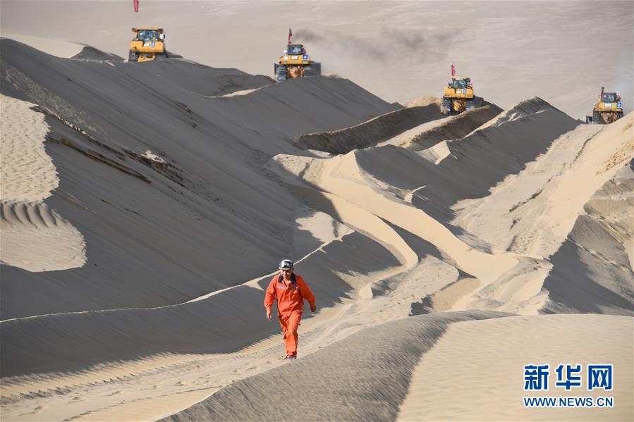 目前,參與施工的工人搶抓工期,有序推進,與風(fēng)沙為伴,奮戰(zhàn)在茫茫沙海深處。為便于施工,工人們把營地搭建在沙山旁,吃住都在沙漠中。生活所需物資、機械設(shè)備所需油料等,均有人定期配送。