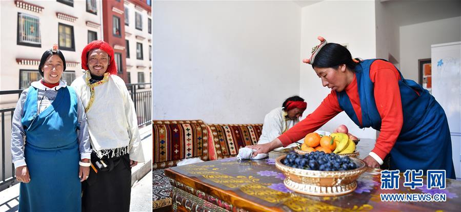 拼版照片:左圖為西藏昌都市八宿縣擁巴鄉(xiāng)娜帕村村民布貢(右)和妻子益西瓊措在安置點樓前;右圖為在八宿縣乃然易地扶貧搬遷安置點,益西瓊措在家里打掃衛(wèi)生。2018年,布貢一家人搬遷到乃然易地扶貧搬遷安置點,住進了三室一廳的新居。和布貢一家一樣,八宿縣擁巴鄉(xiāng)、夏里鄉(xiāng)、瓦鄉(xiāng)的2000余名群眾完成易地搬遷,開啟美好的新生活(5月10日攝)。新華社記者詹彥攝