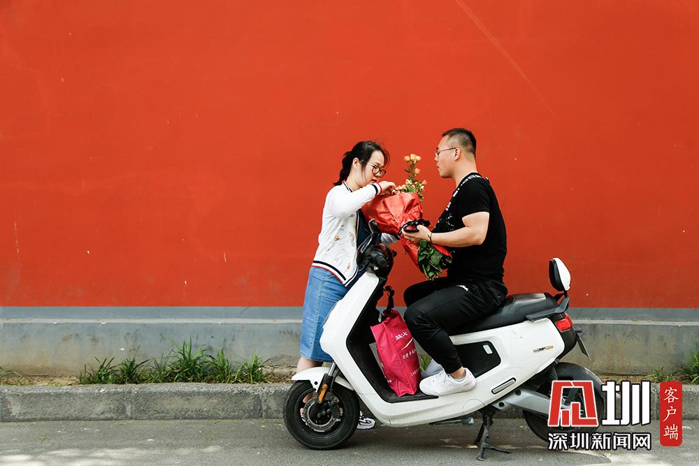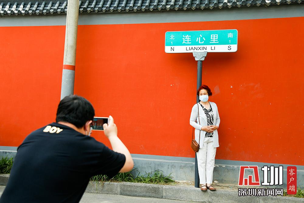 不過,在5月20日當天來這里拍照的情侶或夫妻并不多,反倒有眾多“單身狗”與同性閨蜜一起,在“連心里”的路牌下、紅墻邊,手捧鮮花拍照打卡。