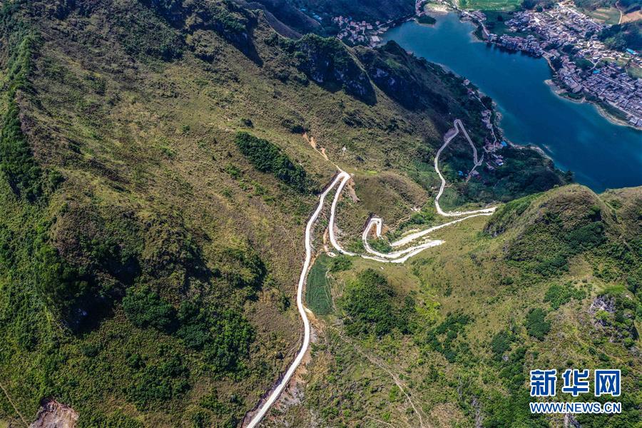 這是去年底通車的大化瑤族自治縣七百弄鄉(xiāng)江棟村那徐屯至弄獎屯公路(5月14日攝,無人機照片)。新華社記者曹祎銘攝