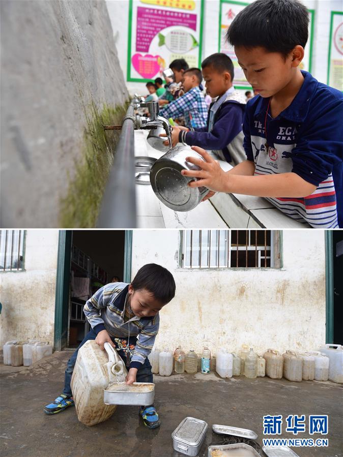 這是一張拼版照片。上圖:在大化瑤族自治縣板升鄉(xiāng)八好小學,同學們在用泉水洗碗(2019年5月7日攝)。下圖:八好小學的同學們用儲備在水桶里的雨水淘米煮飯(2014年11月24日攝)。八好小學有400多名學生,曾僅有一個不足100立方米的水柜,用于收集儲存樓頂?shù)挠晁?,學生需定期定量用水。遇到長時間不下雨,學校需要到鄉(xiāng)政府所在地運水。如今,學校修建了5個大水柜,并從兩公里外引泉水到校園,“飲水難”問題得到解決。新華社記者黃孝邦攝