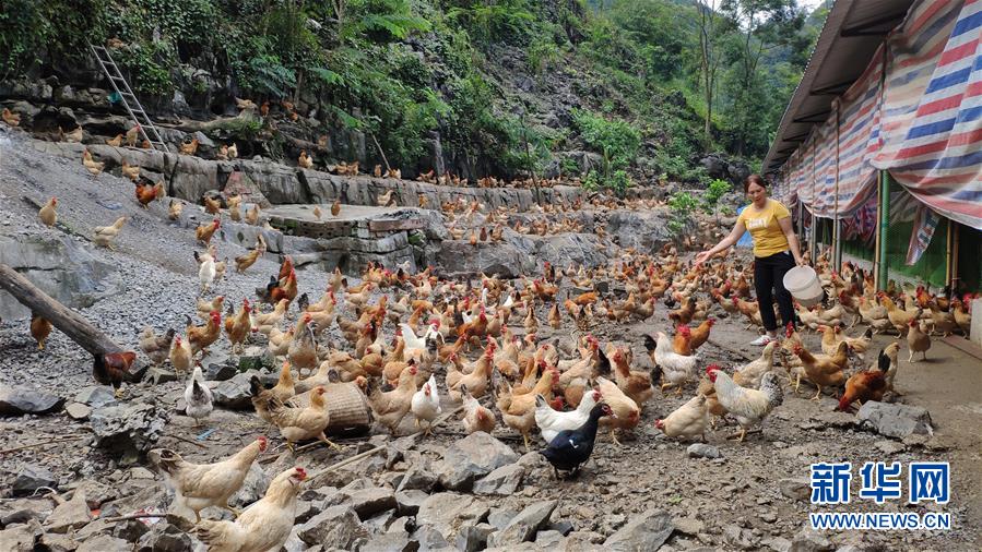 大化瑤族自治縣雅龍鄉(xiāng)勝利村一名群眾在喂養(yǎng)“七百弄雞”(2019年9月11日攝)。新華社記者張愛林攝