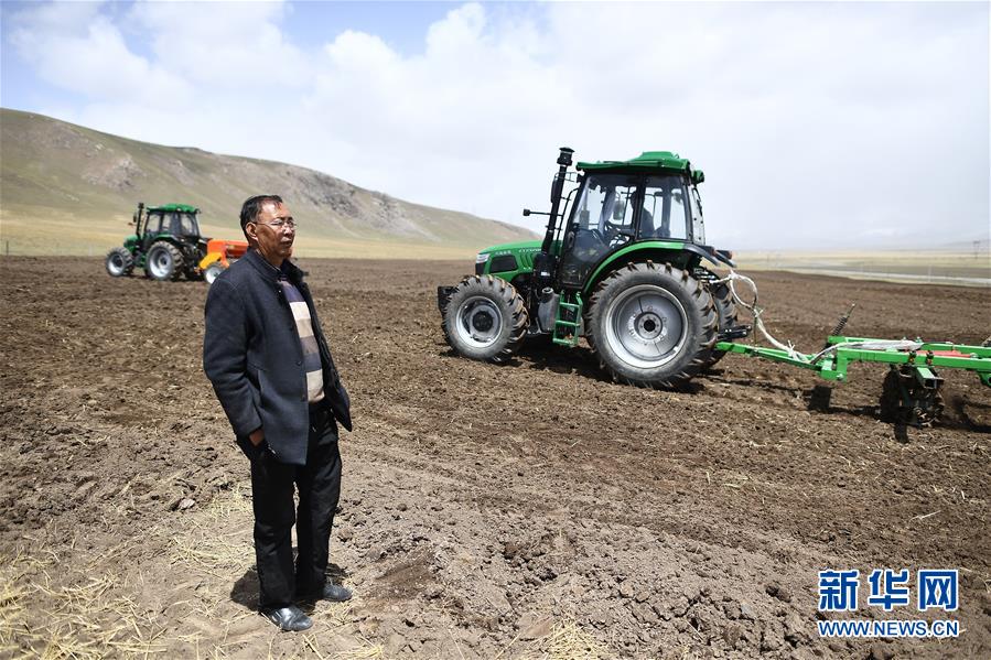 在青海省海北藏族自治州海晏縣青海湖鄉(xiāng)同寶村,者成倉在地里查看播種進度(5月13日攝)。新華社記者張宏祥攝