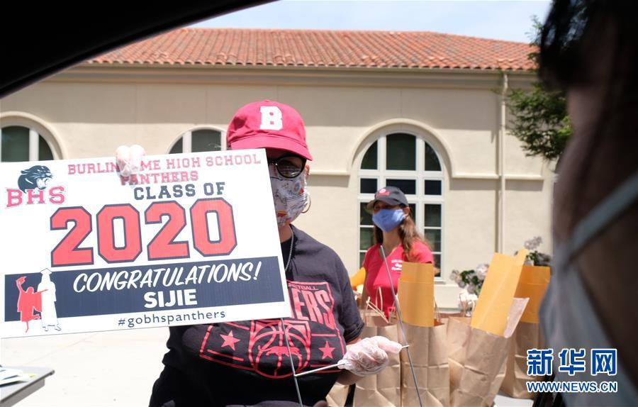 5月22日,在美國加州北部圣馬特奧縣,工作人員歡迎來辦理畢業(yè)手續(xù)的學生。新華社記者吳曉凌攝