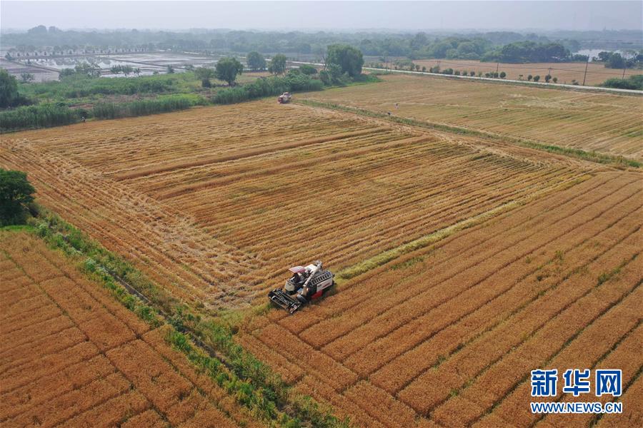5月24日,農(nóng)戶(hù)駕駛收割機(jī)在浙江省湖州市吳興區(qū)八里店鎮(zhèn)尹家圩糧油植保農(nóng)機(jī)專(zhuān)業(yè)合作社的麥田里進(jìn)行收割作業(yè)(無(wú)人機(jī)照片)。新華社記者黃宗治攝