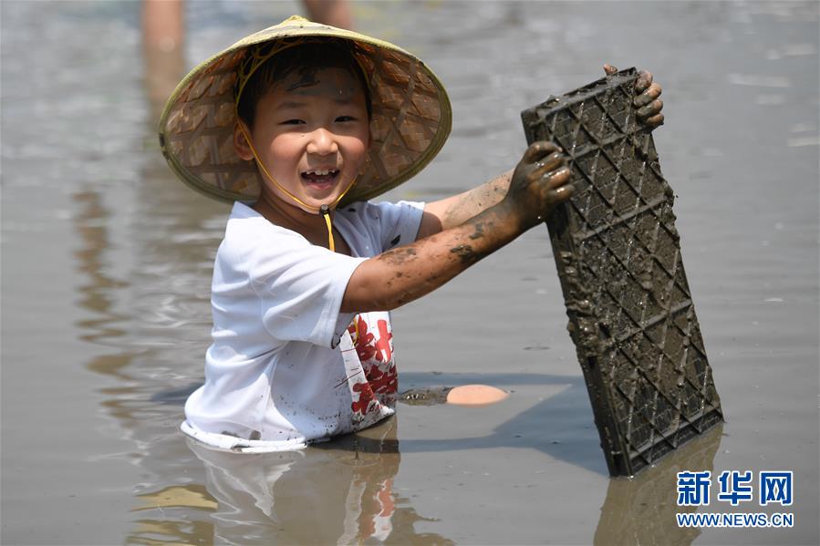 5月24日,一名小朋友在稻田里體驗(yàn)農(nóng)事。當(dāng)日,十余名小朋友在家長(zhǎng)的帶領(lǐng)下來到浙江省湖州市吳興區(qū)八里店鎮(zhèn)尹家圩糧油植保農(nóng)機(jī)專業(yè)合作社的稻田中,參加親子插秧、稻田捉魚等農(nóng)事體驗(yàn)活動(dòng)。新華社記者黃宗治攝