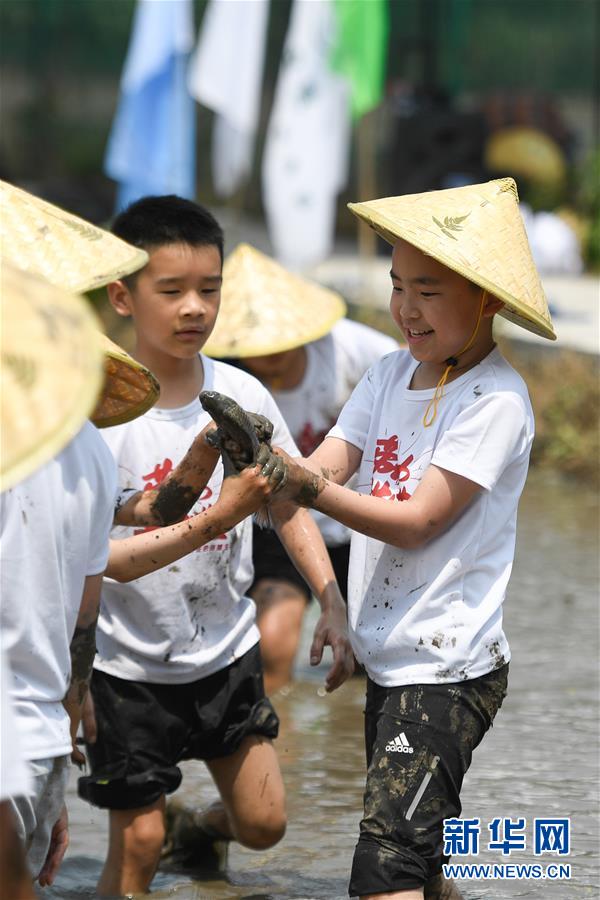 5月24日,小朋友在稻田里捉魚,體驗(yàn)農(nóng)事。當(dāng)日,十余名小朋友在家長(zhǎng)的帶領(lǐng)下來到浙江省湖州市吳興區(qū)八里店鎮(zhèn)尹家圩糧油植保農(nóng)機(jī)專業(yè)合作社的稻田中,參加親子插秧、稻田捉魚等農(nóng)事體驗(yàn)活動(dòng)。新華社記者黃宗治攝