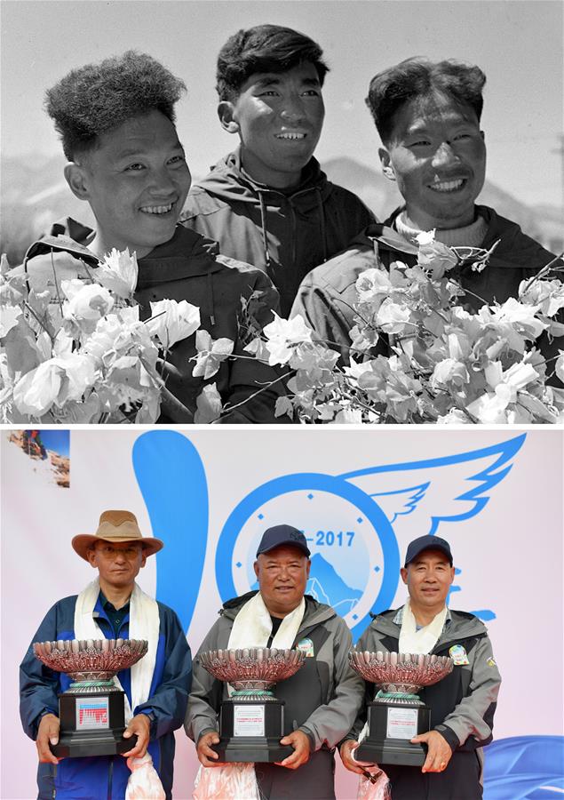 拼版照片:上圖為1960年6月7日,人類歷史上首次從北坡登頂珠峰的中國登山隊隊員王富洲(右)、貢布(中)與屈銀華三人凱旋拉薩后捧花合影(資料照片)。新華社發(fā)下圖為2017年7月12日,在紀念西藏登山隊成功登頂世界14座海拔8000米以上高峰10周年儀式上,隊員次仁多吉(中)、邊巴扎西(左)和洛則獲頒紀念獎杯。新華社記者普布扎西攝