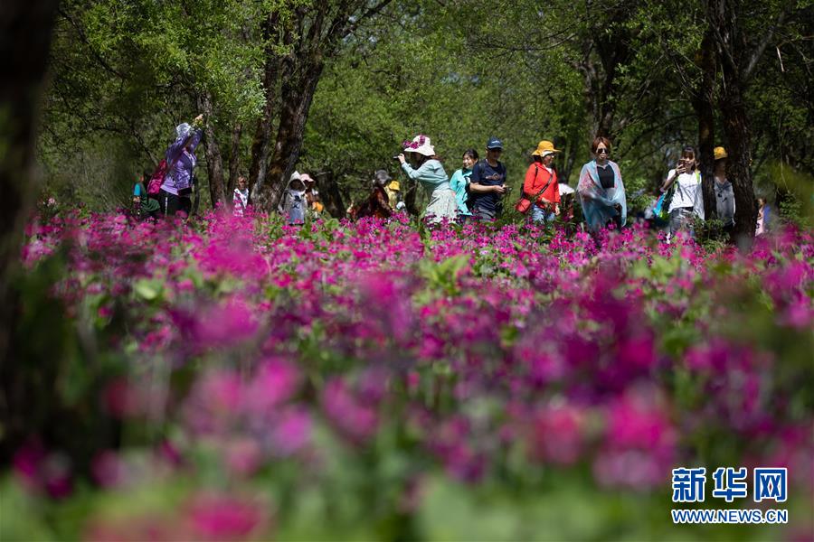 5月24日,游客在四川省漢源縣桌子山上觀賞報(bào)春花。新華社記者江宏景攝