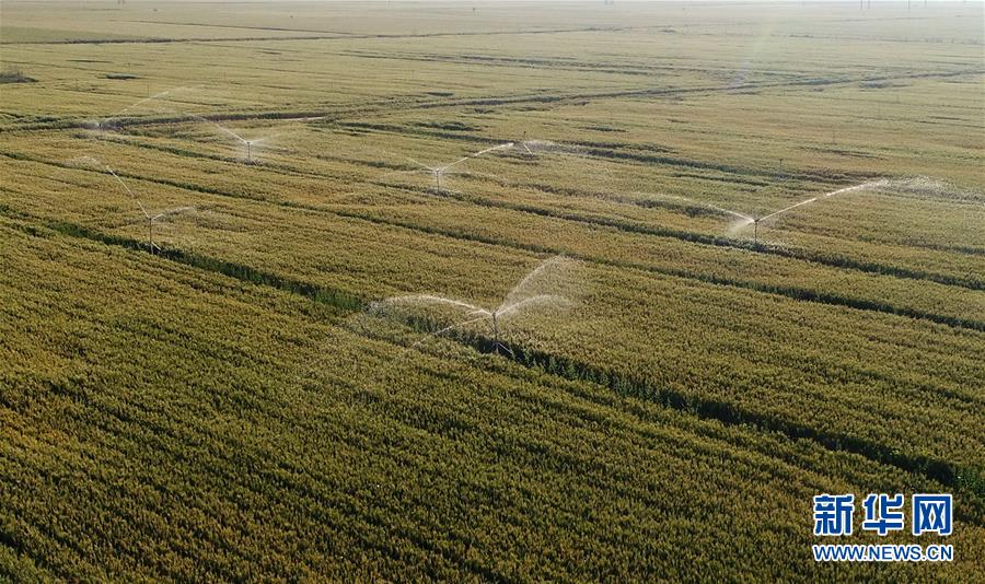 5月26日,內(nèi)丘縣中程村麥田的噴灌設(shè)備在澆灌小麥(無人機照片)。夏日時節(jié),河北省邢臺市內(nèi)丘縣農(nóng)民搶抓農(nóng)時開展麥田后期管理,為小麥增產(chǎn)豐收打好基礎(chǔ)。新華社記者朱旭東攝