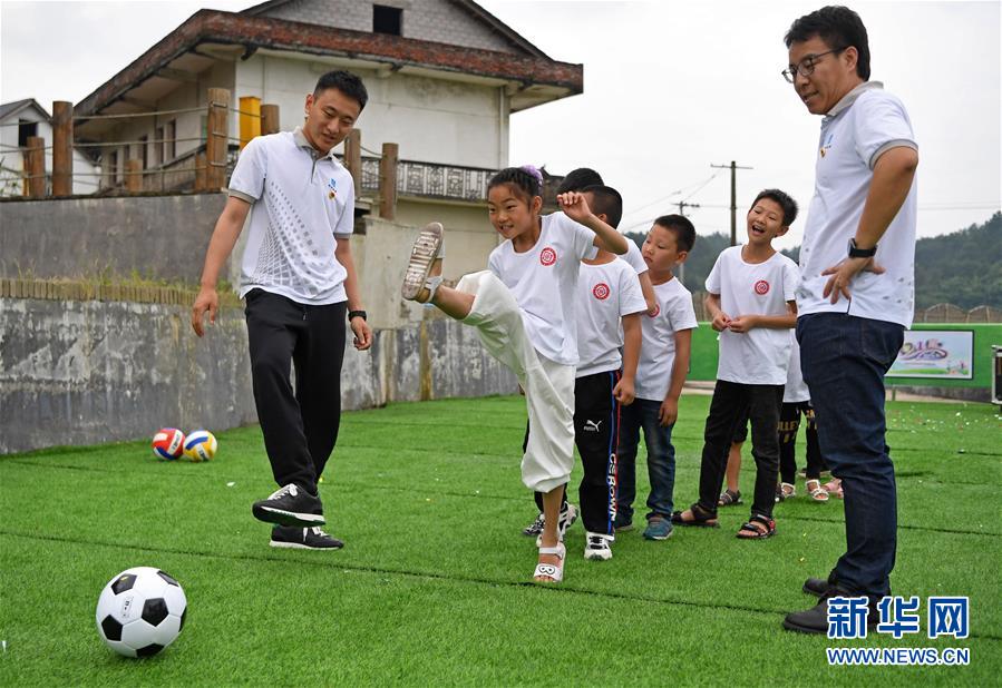5月27日,在江西省貴溪市金屯鎮(zhèn)金屯村渡坊村小組,志愿者和留守兒童一起進(jìn)行體育活動(dòng)。新華社記者萬(wàn)象攝