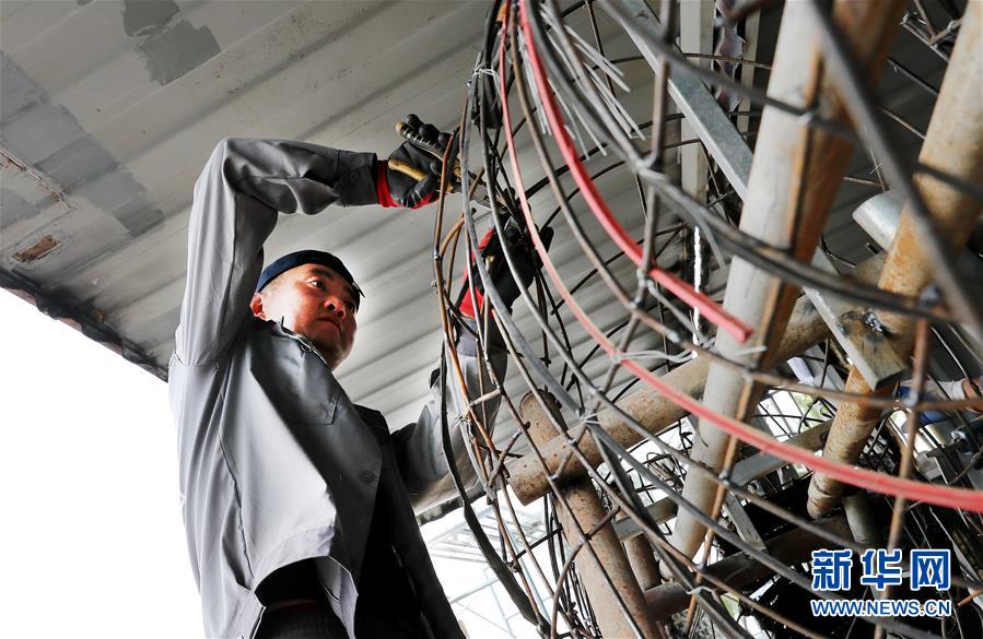 5月27日,制作團(tuán)隊(duì)成員李剛在中轉(zhuǎn)服務(wù)站工棚內(nèi),用廢舊鋼絲制作牛造型工藝品的身體部分。新華社記者方喆攝