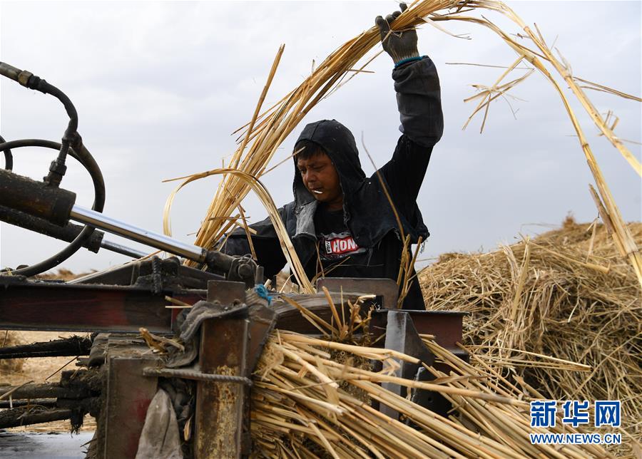 5月20日,在新疆博湖縣西南河口葦場(chǎng),工人將蘆葦打包。新華社記者宋彥樺攝